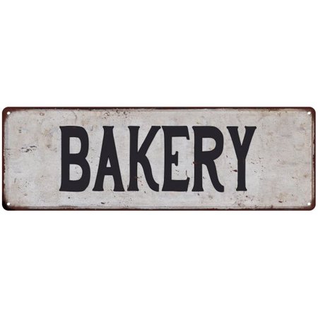The most common metal bakery sign material is metal. Advertising fresh baked goods and homemade pies since 1945. Bakery, 6 x 16 inch metal farmhouse sign, rustic vintage wall decor for home, restaurant, cafe, diner and coffee shop, farm theme gifts for farmers, ranchers, animal lovers. Retro graphics embossed into the metal with a distressed finish.